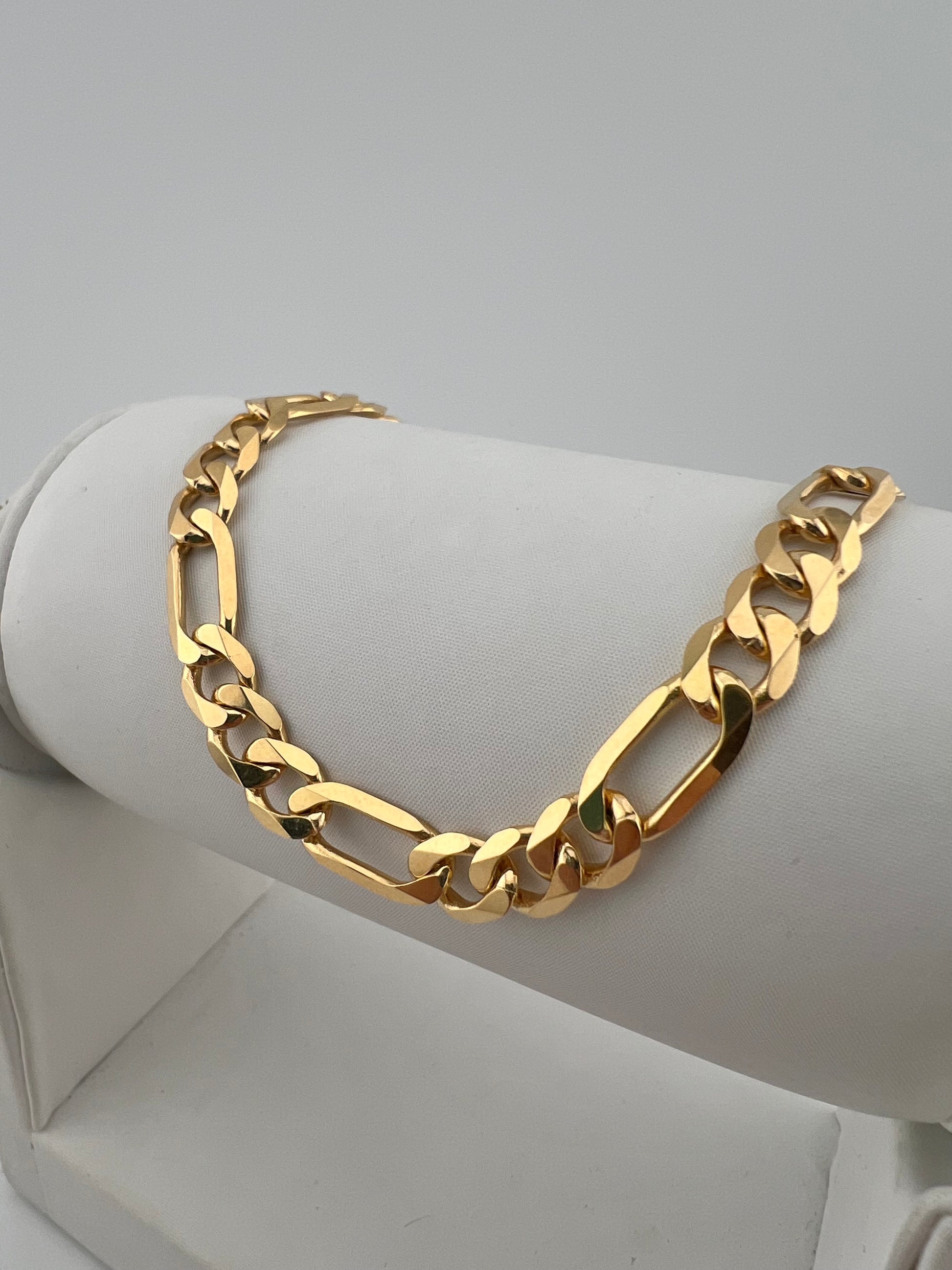 NEW & UNUSED! FULL UK HALLMARK! GENUINE SOLID 9CT YELLOW GOLD! NOT GOLD FILLED! NOT GOLD PLATED! NEW Solid 9ct yellow gold men's chunky 7mm wide solid Figaro chain. This Italian made men's bracelet has a heavy weight, high polish finish and full UK hallmark. It is top quality with a great flashy look and very substantial feel. Width: 7mm Thickness: 1.4mm Length: 18 Inch - 28 Grams. 20 Inch 31 Grams. 22 Inch - 35 Grams. 24 Inch 38 Grams. 28 Inch - 44 Grams. 30 Inch - 47 Grams Hallmark: FULL UK & 375 Stamped Fastening: Lobster Clasp Jewellery Box: Included Matching bracelets also available. FREE delivery to all UK destinations. *Dimensions & weight are based on a stock average and may vary but is not subject to price change. |