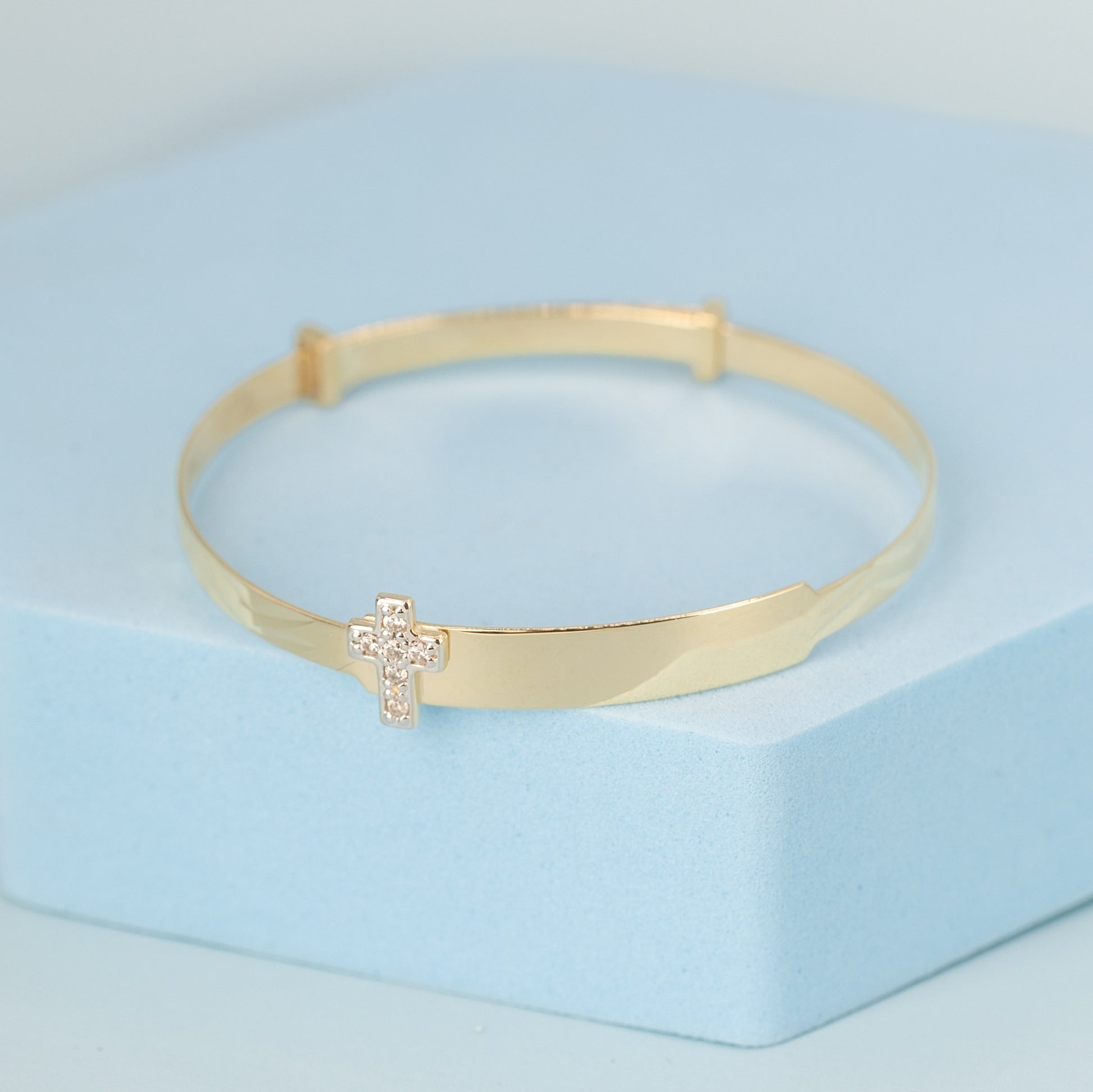 Solid 9ct Yellow Gold Baby / Kids Cz Cross ID Expandable Bangle