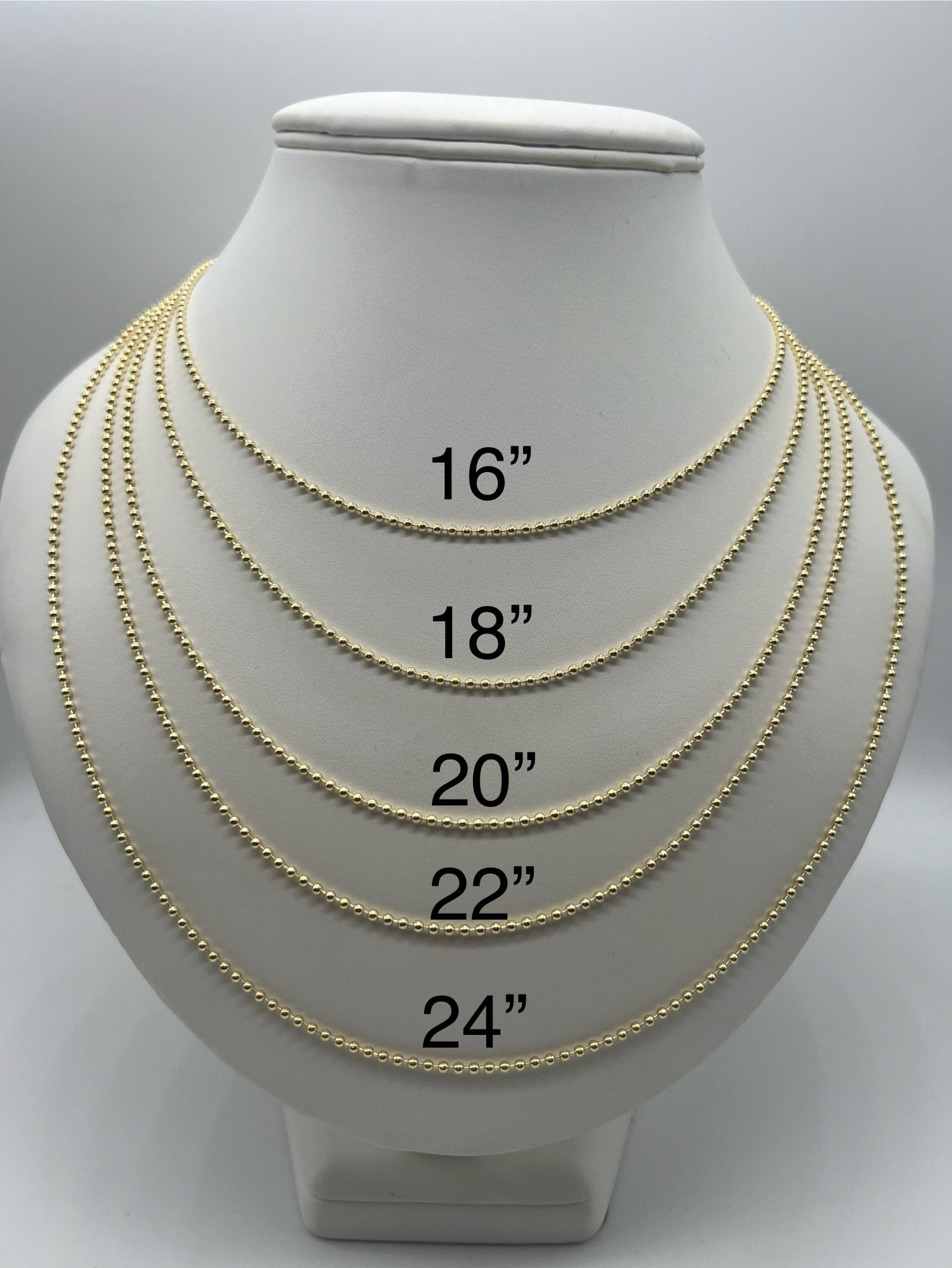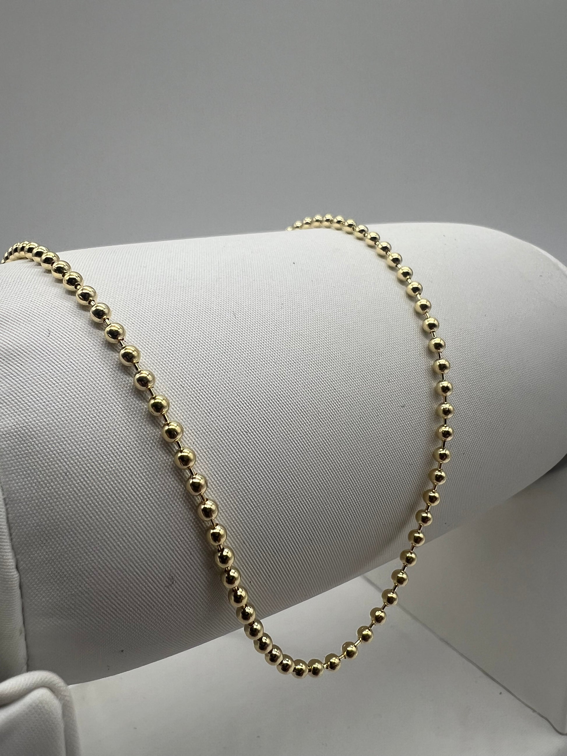 Stocked in the UK, solid gold traditional ball / bead chains in 16, 18, 20, 22 & 24 inches. Perfect for stacking, wearing along or with a pendant.